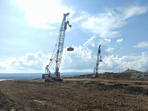 面對(duì)工程難度大、工期緊的局面,項(xiàng)目部本著對(duì)業(yè)主負(fù)責(zé)的原則,科學(xué)組織、周密部署,以高質(zhì)量建設(shè),嚴(yán)標(biāo)準(zhǔn)管理,樹立責(zé)任意識(shí)、質(zhì)量意識(shí)和精品意識(shí),以極大的熱情和扎實(shí)有效的工作投入到項(xiàng)目建設(shè)中來。為了應(yīng)對(duì)區(qū)域回填土質(zhì)差無法施工的問題,項(xiàng)目部與甲方協(xié)商后采用在填土層上鋪設(shè)碎石料的方法,有效解決了泥濘場(chǎng)區(qū)強(qiáng)夯施工難題。為了追趕工期,項(xiàng)目部在原有3臺(tái)夯機(jī)施工的基礎(chǔ)上,攻堅(jiān)克難,積極籌備,再次增添2臺(tái)強(qiáng)夯設(shè)備,并組織人員加班加點(diǎn)全力施工,大大提高了施工進(jìn)度。