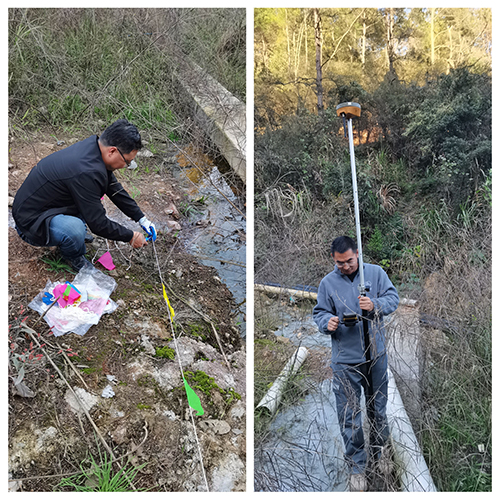 項(xiàng)目駐地氣候濕潤多雨,場地濕滑崎嶇,遍地都是灌木叢,對前期測量放線和圈地工作的開展十分不利。然而項(xiàng)目部人員無所畏懼,奮勇向前,充分發(fā)揮“地質(zhì)三光榮”精神,積極踐行國家“兩山”理念,將生態(tài)文明治理的使命融合成地質(zhì)人的信念,縱使泥濘滿身、荊棘刺背,帷幕線所指,我亦所往。