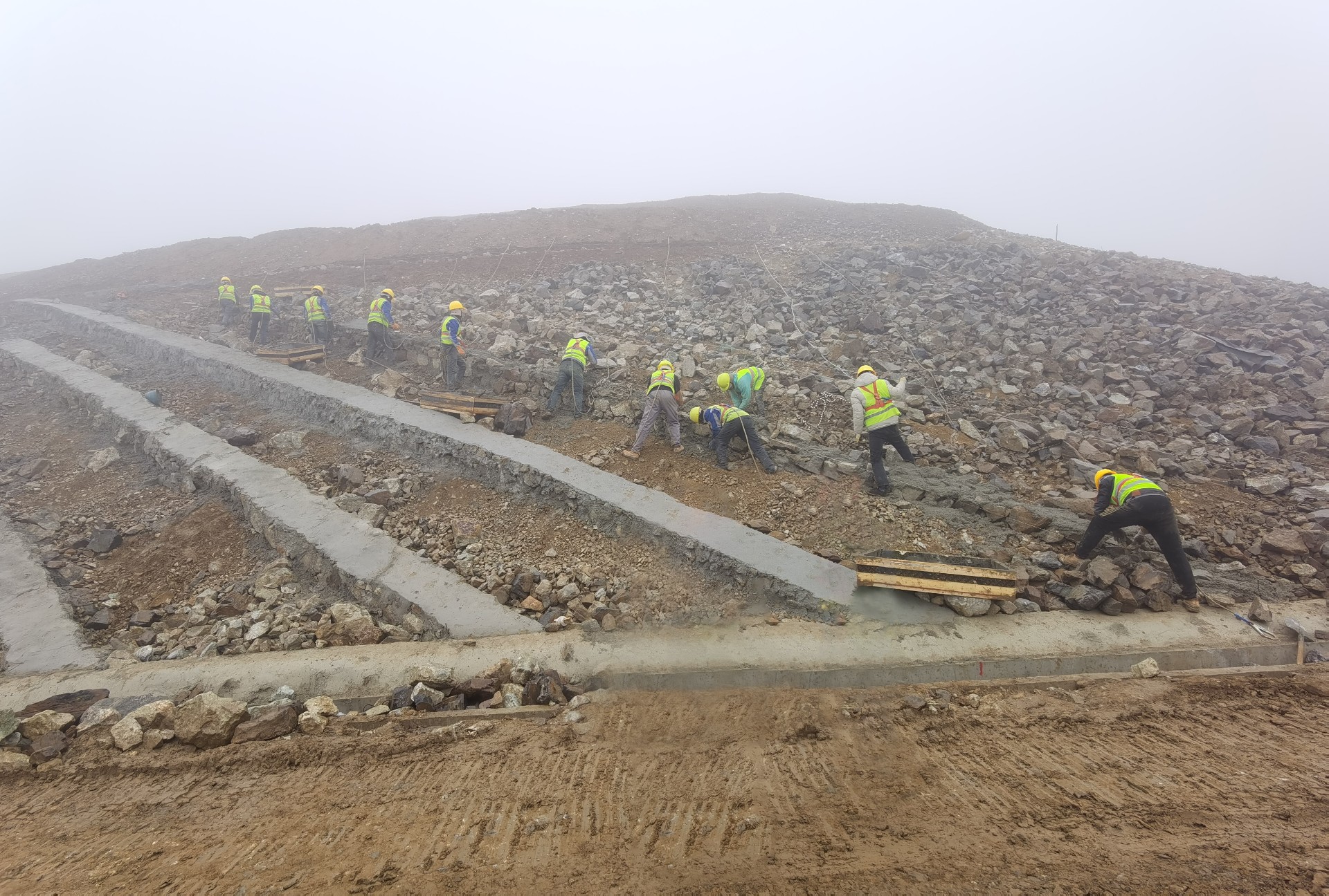 落地該項(xiàng)目后,公司立即組建一支“經(jīng)驗(yàn)豐富、作風(fēng)優(yōu)良、技術(shù)過硬”的精銳“力量”,全面統(tǒng)籌開展工作。走進(jìn)項(xiàng)目會議室,映入眼簾的是一場激烈的技術(shù)研討會。項(xiàng)目負(fù)責(zé)人帶領(lǐng)團(tuán)隊(duì)正在討論牛馬塘排土場植被恢復(fù)施工過程中削坡減載、覆土綠化和牛馬塘采場掛網(wǎng)護(hù)坡時坡度陡峭、塊石多、垂直高差在300米等如何施工的技術(shù)難題,像這樣的“集中力量辦大事”的集體討論成為常態(tài),亦是這支“王牌軍隊(duì)”的特色。為解決用電用水難題,項(xiàng)目部經(jīng)常前往業(yè)主方進(jìn)行協(xié)商,期望業(yè)主盡快解決生活用水用電問題,保證員工的正常生活。由于施工場地地形錯綜復(fù)雜,道路崎嶇,施工前期為了讓機(jī)械順利進(jìn)場,項(xiàng)目部不懼每日的風(fēng)雪交加奔波于業(yè)主方、監(jiān)理方、設(shè)計(jì)方之間,先后協(xié)調(diào)了近5家相關(guān)施工單位,保證機(jī)械盡早盡快進(jìn)場施工?!澳壳绊?xiàng)目部近半技術(shù)人員具有參加過院隊(duì)重點(diǎn)項(xiàng)目的工作經(jīng)驗(yàn),對項(xiàng)目順利推進(jìn)起到關(guān)鍵作用?!表?xiàng)目現(xiàn)場負(fù)責(zé)人齊海濤介紹說。